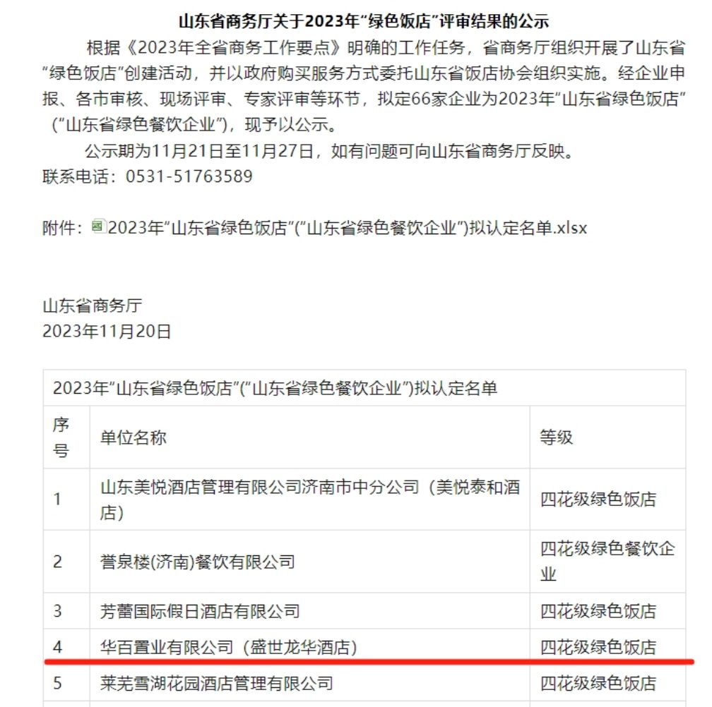 近日,山東省商務(wù)廳批準華百置業(yè)盛世龍華酒店山東省四花級綠色飯店稱號,這是濟陽區(qū)首個申報并評審?fù)ㄟ^的省級綠色飯店,全省僅14家飯店獲此榮譽。