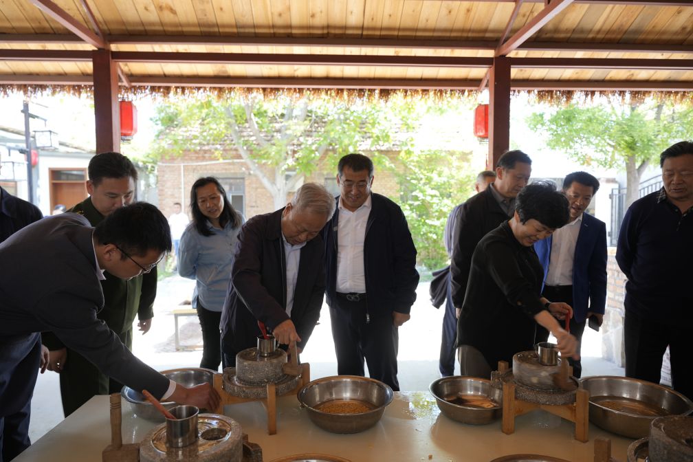 張主任一行實地參觀了基地的易豐居民宿、龍格黑陶藝術(shù)研究院、濟水春秋博物館、易豐豆工坊等。聽取了長田實業(yè)黨支部書記、董事長張勇同志關(guān)于基地運營情況、研學活動接待狀況等方面的匯報。