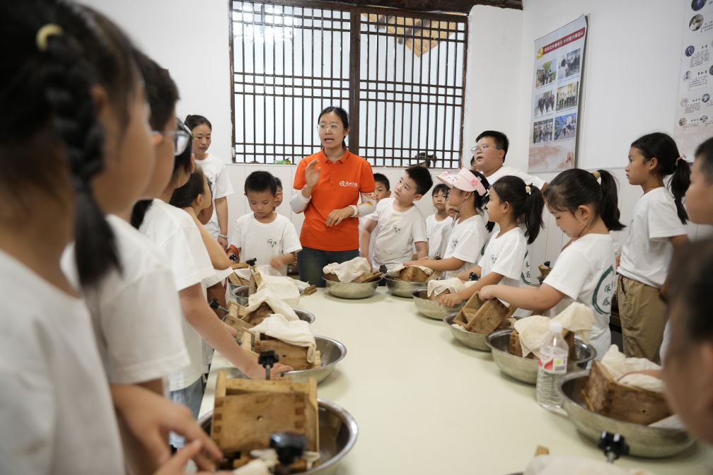 隨后,研學(xué)老師將豆花一一分至孩子們手中,放入木質(zhì)模具中用重物壓實,隨著水分流出,一塊豆腐便制作完成了。在制作過程中,不僅見證了"黃豆"到"豆腐"的奇妙變化,還能體驗傳統(tǒng)手藝的魅力,領(lǐng)略中國飲食文化的博大精深。
