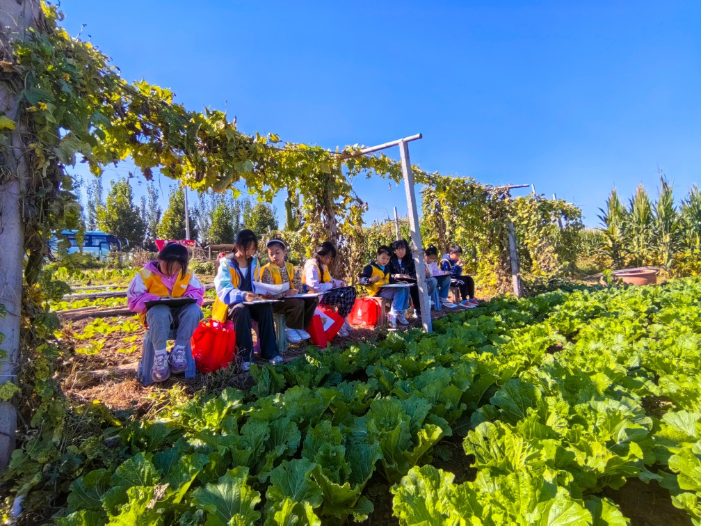 絲瓜藤下,陽光透過綠葉灑下斑駁的光影,映照在孩子們的臉上,他們拿起畫筆,將這份寧靜與美好定格在畫布上。畫筆輕觸,色彩在紙間跳躍,每一筆都仿佛在與大自然對話,講述著秋天獨有的故事。