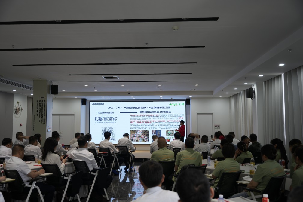 參觀結(jié)束后,眾人齊聚會(huì)議室,參加由金曄食品創(chuàng)始人李金倫主講的學(xué)習(xí)交流會(huì)。在分享中,李總以“回歸原點(diǎn)創(chuàng)造美好”為主題,結(jié)合金曄的成長(zhǎng)故事,深入闡釋了企業(yè)如何將稻盛經(jīng)營(yíng)學(xué)融入日常經(jīng)營(yíng),如何把“敬天愛人”的理念落地生根,深入淺出地分析了當(dāng)前食品行業(yè)的發(fā)展趨勢(shì)和挑戰(zhàn),并分享了企業(yè)如何在市場(chǎng)競(jìng)爭(zhēng)中堅(jiān)守初心、不斷創(chuàng)新的重要性。他講到,回歸原點(diǎn)就是回歸簡(jiǎn)單純粹和真誠(chéng)善良,人生和經(jīng)營(yíng)的成功無非是回歸原點(diǎn)的行動(dòng)。他強(qiáng)調(diào),企業(yè)需將哲學(xué)思維(如稻盛和夫理念)與實(shí)戰(zhàn)管理(如華為流程優(yōu)化)融合,形成獨(dú)特的經(jīng)營(yíng)體系。他還提出用戶導(dǎo)向,通過“空椅子”機(jī)制讓用戶虛擬參與決策,分歧時(shí)優(yōu)先遵循用戶立場(chǎng);首創(chuàng)無添加山楂制品,以包裝革新(自立袋、拉鏈設(shè)計(jì))提升體驗(yàn);拆分職能部門為“傳統(tǒng)+現(xiàn)場(chǎng)”雙線,推行阿米巴模式激發(fā)團(tuán)隊(duì)自主性。李總對(duì)企業(yè)使命的解讀、對(duì)員工關(guān)懷的重視、對(duì)讀書學(xué)習(xí)的熱愛和感受,以其豐富的經(jīng)驗(yàn)和獨(dú)到的見解,讓與會(huì)者深受啟發(fā),進(jìn)一步認(rèn)識(shí)到企業(yè)文化與價(jià)值觀在企業(yè)發(fā)展中的核心作用。