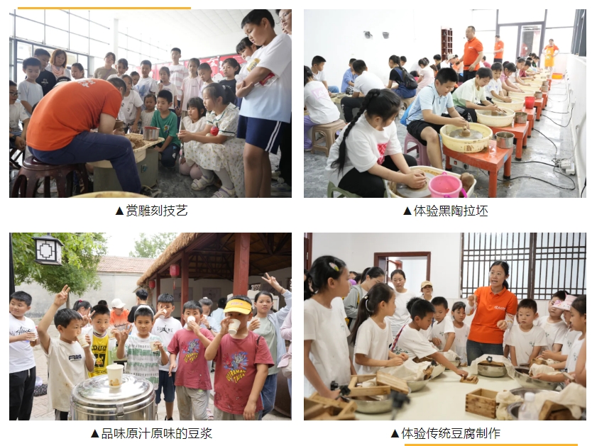 在課程研發(fā)中,基地主導(dǎo)打造“陶藝匠心”“非遺工坊”等特色項(xiàng)目,將濟(jì)陽(yáng)黑陶制作、傳統(tǒng)手工藝等非遺技藝融入教學(xué),讓傳統(tǒng)文化“可觸摸、可參與”。例如,在“陶藝匠心”課程中,學(xué)生可觀生產(chǎn)工藝、賞雕刻技藝和拉坯表演,更能親手制作黑陶器皿,感受黃河流域陶藝文化的千年底蘊(yùn);“古法豆腐”研學(xué)課程中,深入挖掘傳統(tǒng)豆腐制作工藝,讓學(xué)生親手參與從選豆、泡豆、磨漿、煮漿到點(diǎn)鹵、壓模的全過(guò)程,在實(shí)踐中體會(huì)傳統(tǒng)工藝的魅力。